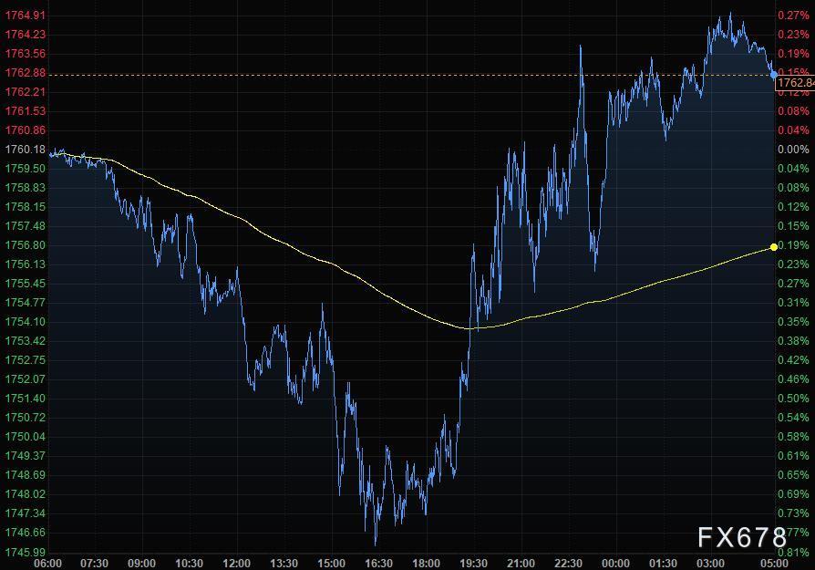 金价周三小幅上扬,陷于狭窄区间内,现货黄金收报1762.84美元/盎司,因美债收益率回落,但美元走强限制了黄金的涨势,投资者等待本周晚些时候公布的美国就业市场数据。