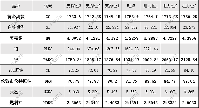 外盘黄金、白银、原油等商品期货阻力支撑位