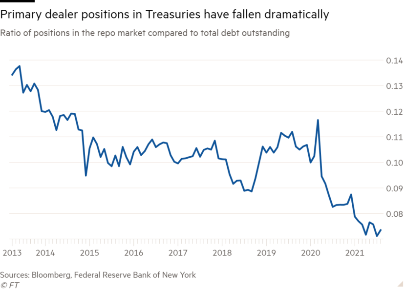 一级交易商直接与财政部进行交易,理论上,当其他投资者试图出售时,这些一级交易商应当作为买家入场,以支持市场。但是2008年金融危机之后的《多德·弗兰克法案》,迫使商业银行在其资产负债表上持有更多的资产,以抵消其债务。作为回应,一级交易商减少了其持有的债务数量。