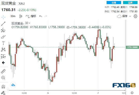 美市盘中,现货黄金一度跌至17551.83美元低点,但随后很快反弹逾10美元,现交投于1760美元略上方。
