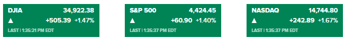道琼斯指数一度上涨逾540点或近1.6%。标普500指数上涨1.5%,以科技股为主的纳斯达克综合指数上涨超1.7%。周四的上涨使本周主要股指均上扬。