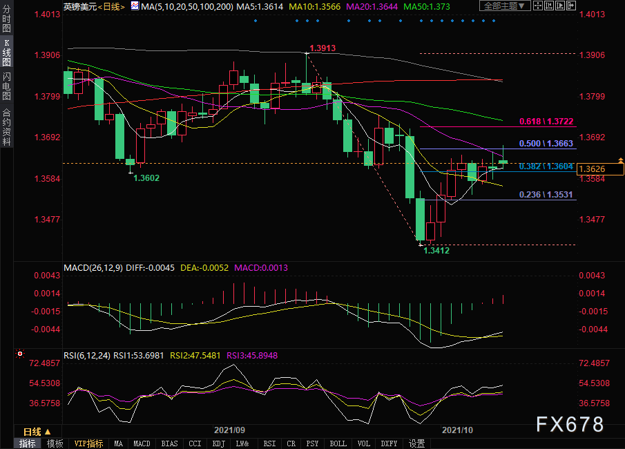 下方支撑位关注1.3600、1.3567、1.3531,上方阻力位关注1.3663、1.3722、1.3751。