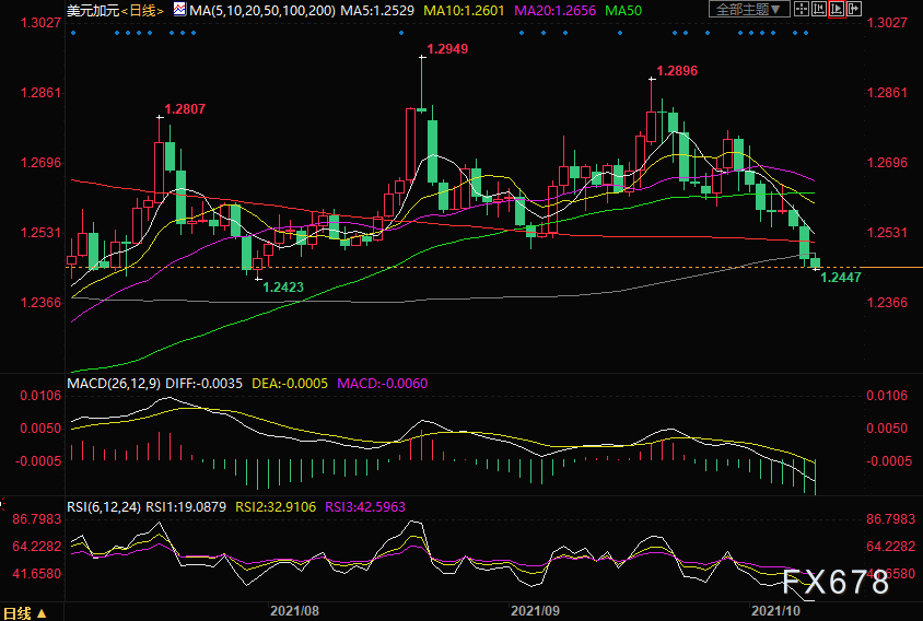 若日内收盘于100日均线下方,则美元兑加元将指向7月30日低点1.2423附近,再往下1.24关口值得关注。