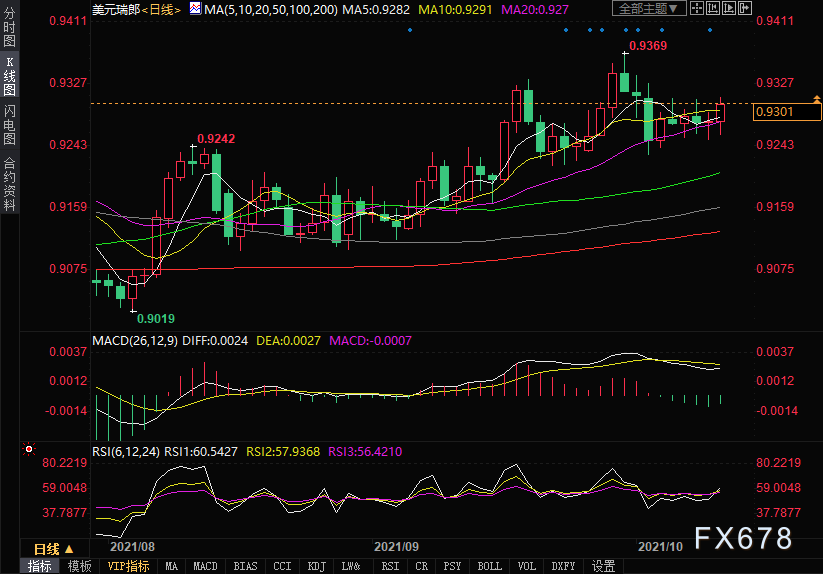 周二(10月12日)美元兑瑞郎在0.9255附近吸引了一些低位买盘,并在美元大举反弹的形势下升至0.93附近。