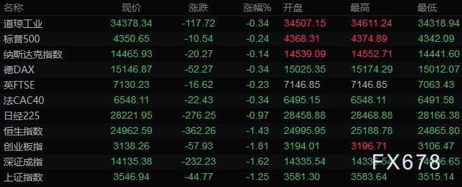 美股收盘情况:标普500指数下跌0.2%,报4350.65点;道琼斯工业平均指数下跌0.3%,报34378.34点;纳斯达克综合指数下跌0.1%,报14465.92点;纳斯达克100指数下跌0.4%,报14662.11点;罗素2000指数上涨0.6%,报2234.271点。