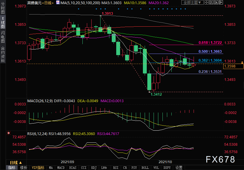 上方关注日高1.3644,进一步关注10月11日高位1.3674以及50日均线所在的1.3725。