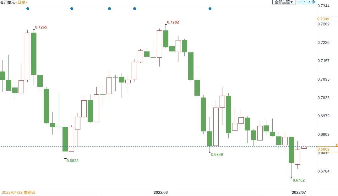 北京时间7月5日8:43,澳元兑美元报0.6877/79。