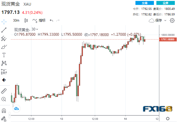 美市盘中,现货金上涨0.2%,交投于1797美元一线,稍早一度突破1800美元关口,触及9月15日以来的最高点1800.49美元。