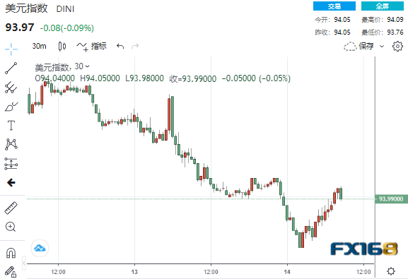 美市盘中,美元指数下跌约0.1%,交投于93.97一线,稍早一度触及10月4日以来的最低水平93.76。周二,该指数一度升至一年高点94.56。