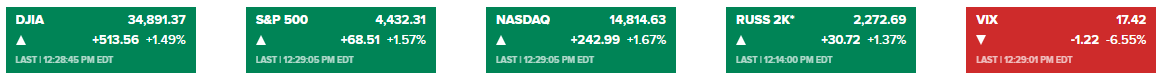 道琼斯指数上涨逾510点,涨幅达近1.5%;标准普尔500指数上涨近1.6%;纳斯达克综合指数上涨1.7%。