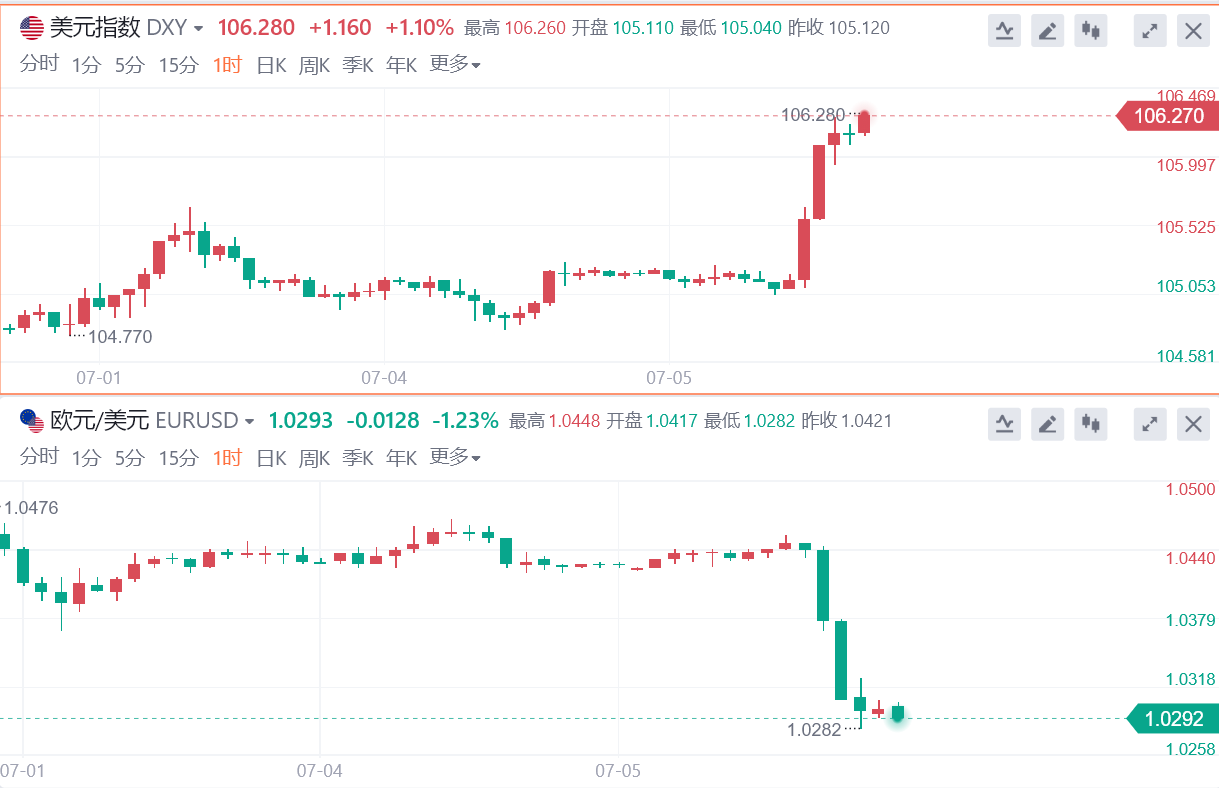 周二欧盘,美元指数突破前高105.79,续刷2002年12月以来新高,向上触及106,日内涨1%。