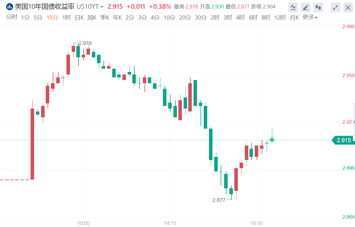 10年期美债收益近期则因避险买需而走低,一度下破2.9%。