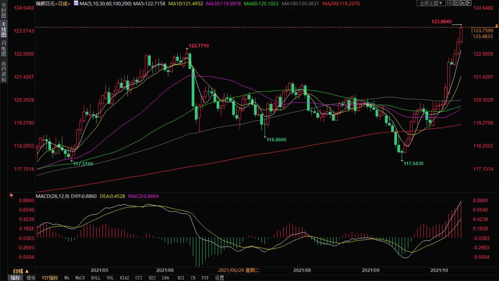 瑞郎兑日元周线上涨2.31%,报收于123.7590,因为人们担心全球经济正在走向通胀高于正常水平、但增长微乎其微或者陷入停滞的环境,瑞郎正在展示其避险货币地位。
