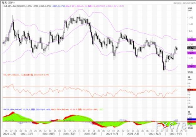 数据显示,美国9月零售销售月率与前值持平,增长0.7%,意外好于预期-0.2%,且前值从0.7%上修至0.9%。核心零售销售月率增长0.8%,也好于预期0.5%。靓丽的数据加上当周美国银行财报表现不俗,提振市场风险偏好情绪。风险货币中,英镑明显领跑,这是因为英国的加息预期正在不断高涨。不过,仍处于年内高点以来的下行趋势线的打压之下。日图以大阳线收回早前失地,近期反弹势头猛烈但当前测试7月30日高点以来的下降趋势线,仍对进一步上行保持谨慎。4小时图突破早前一天回调高点,但随机指标熊背离。小时图震荡上行短线在1.3770上方有回调信号。上方只有突破1.3820之上,方显明显的趋升态势。
