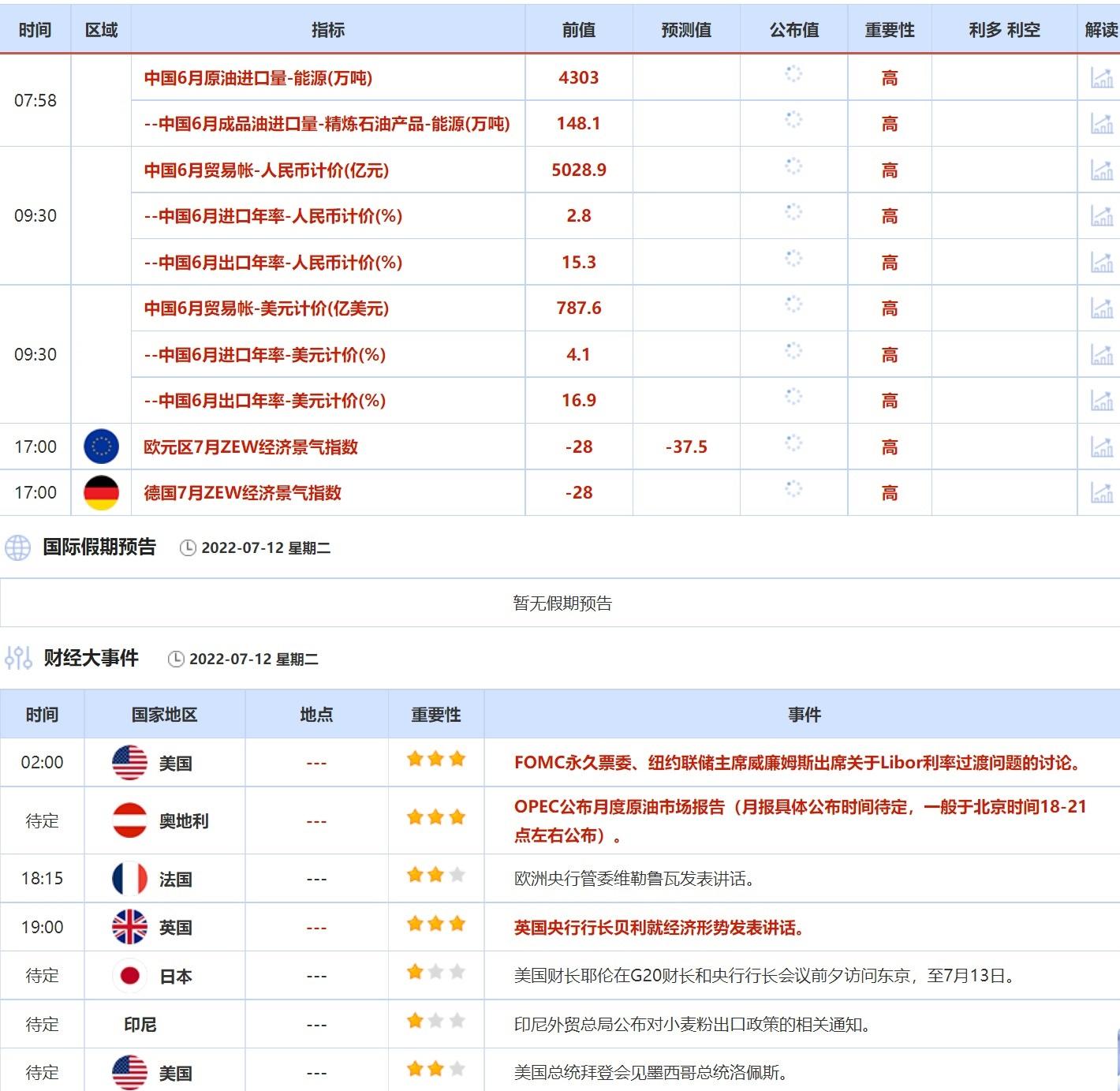 7月12日,FOMC永久票委、纽约联储主席威廉姆斯出席关于Libor利率过渡问题的讨论。此外,英国央行行长贝利就经济形势发表讲话。