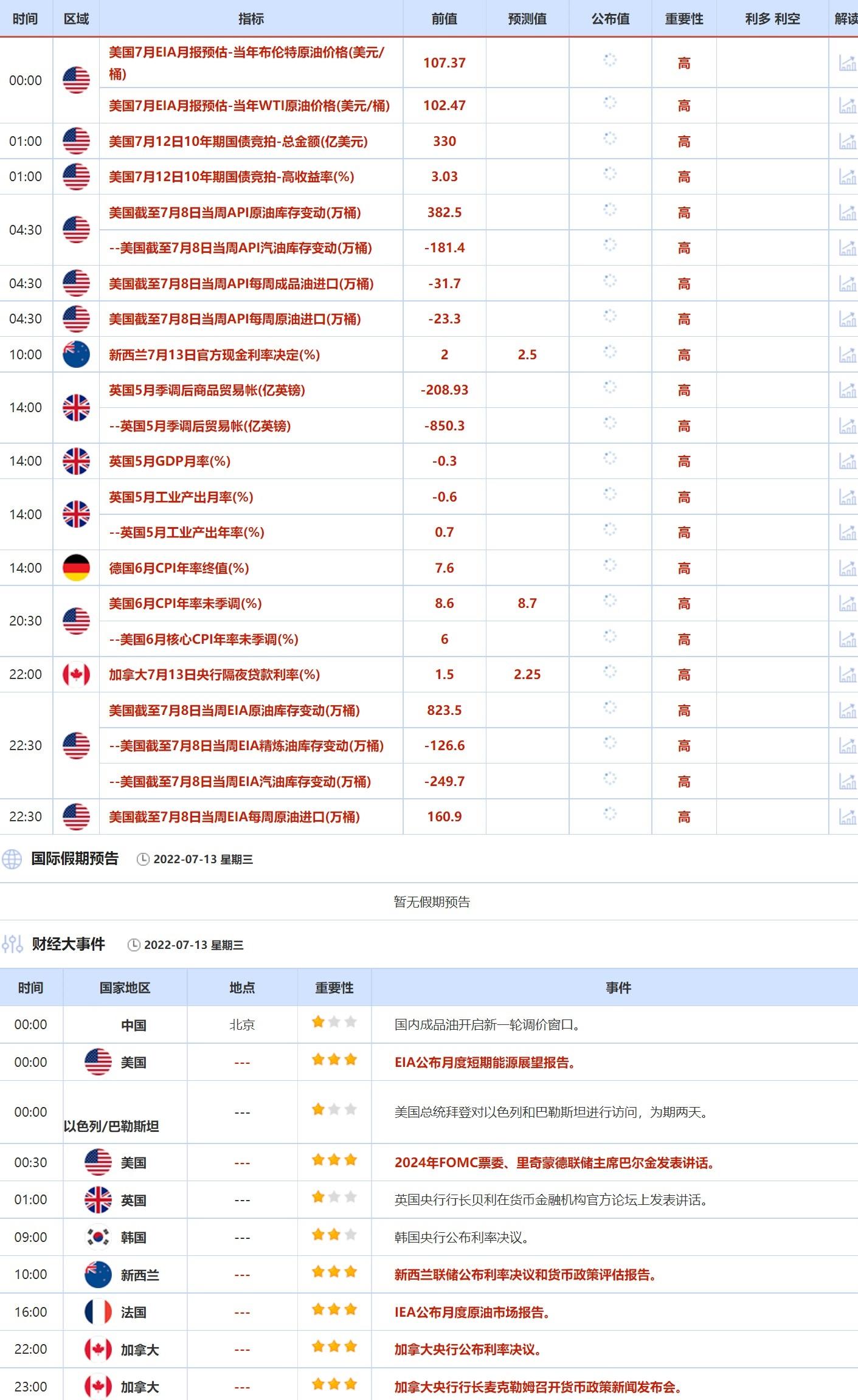 ③7月13日(周三)关键字:美国截至7月8日当周EIA原油库存变动,新西兰联储和加拿大央行利率决议