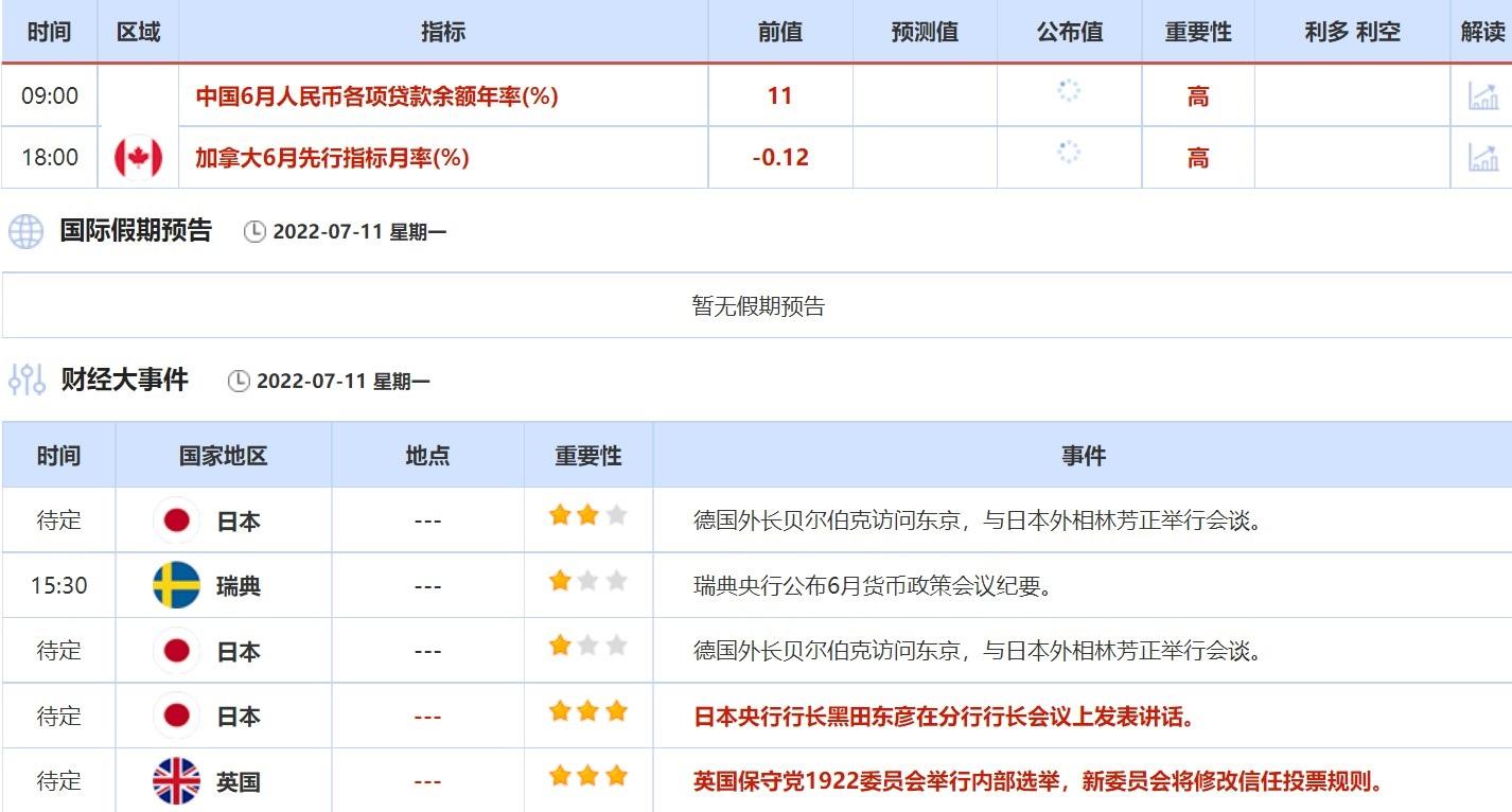 7月13日,新西兰联储公布利率决议和货币政策评估报告,加拿大央行公布利率决议。调查称,22位分析师中的20位表示,新西兰联储将于7月13日的会议上将基准利率上调50个基点至2.50%;2位认为会上调至2.25%。