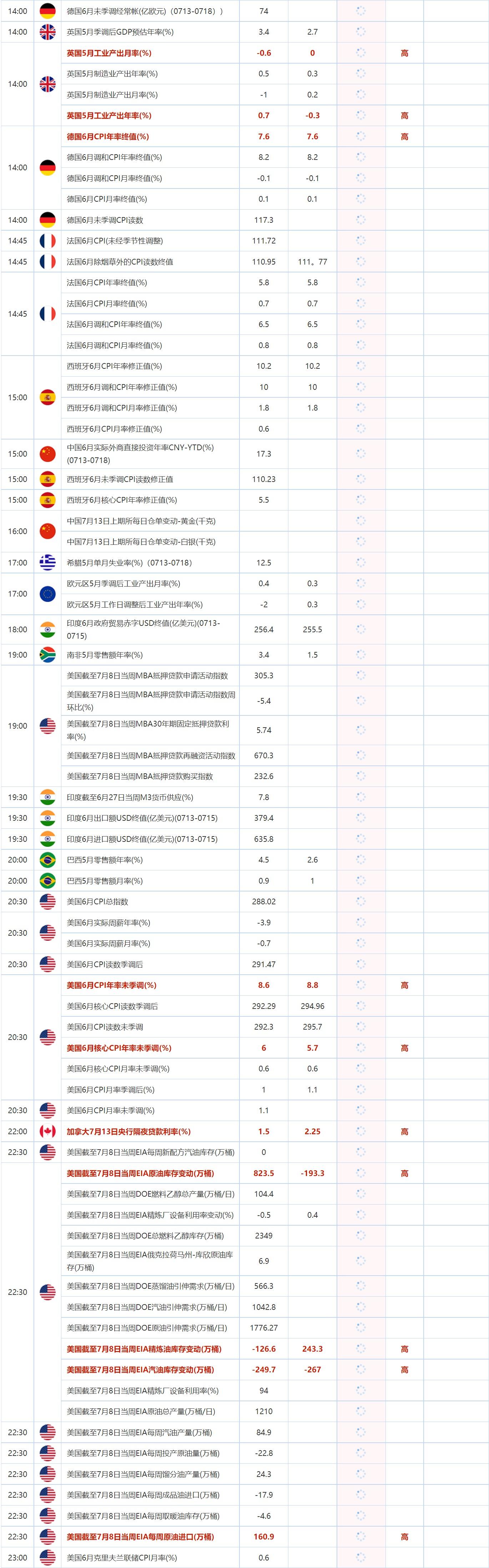 20:30 美国6月CPI年率未季调(%) , 前值 8.6 , 预期值 8.8 , 公布值:待发布