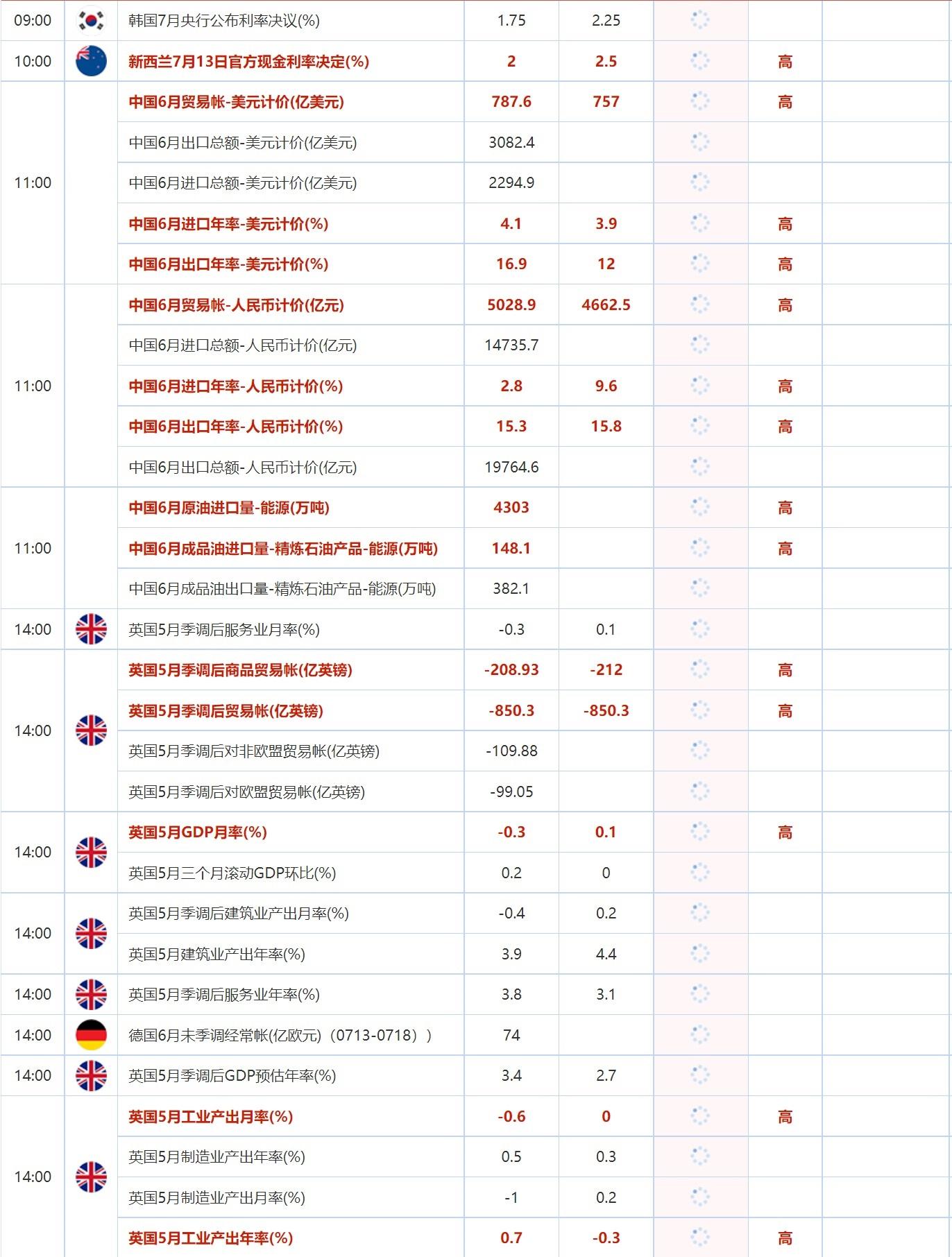 11:00 中国6月进口年率-人民币计价(%) , 前值 2.8 , 预期值 9.6 , 公布值:待发布