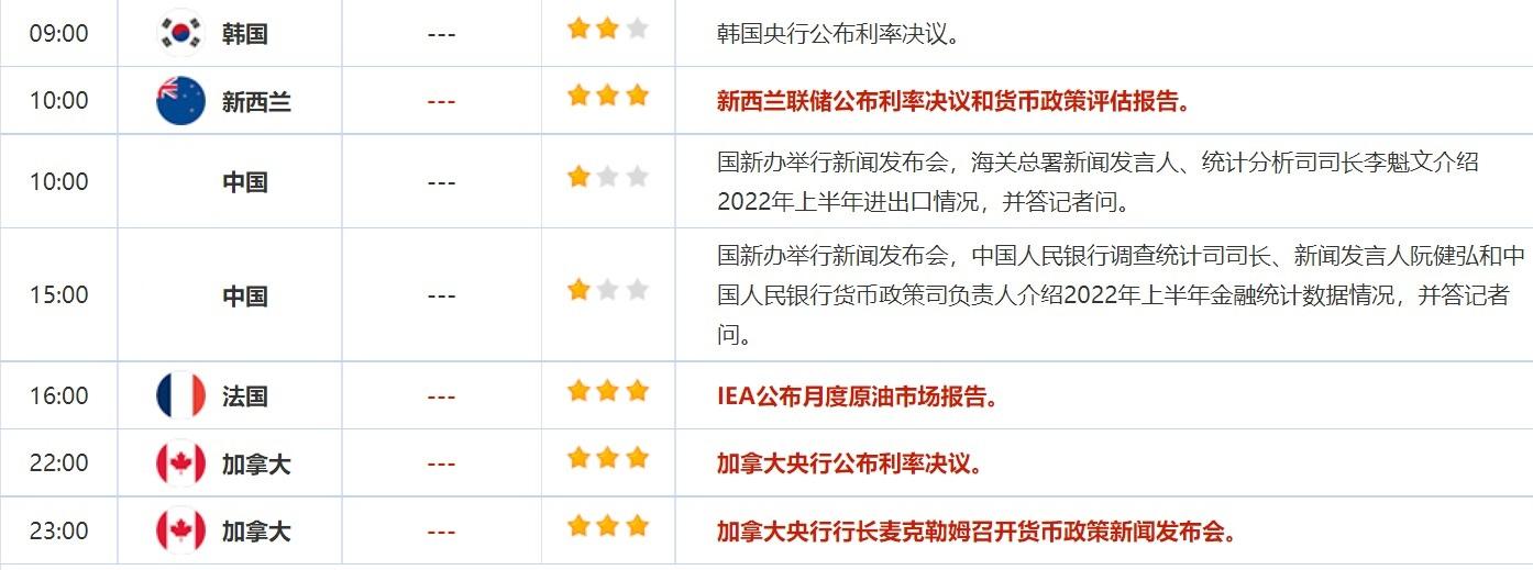 09:00 韩国7月央行公布利率决议(%) , 前值 1.75 , 预期值 2.25 , 公布值:待发布