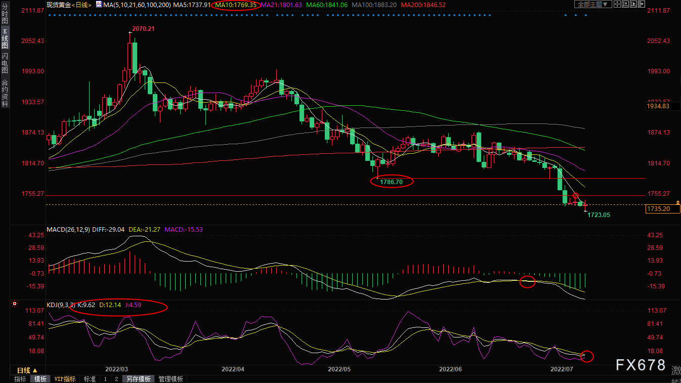 不过,近几个交易日金价跌势放缓,1721.76附近支撑相对较强,KDJ发出超卖信号后有金叉趋势,金价存在震荡反弹的机会;初步阻力在日内高点1744.20附近,进一步阻力在上周五高点1752.36附近,10日均线阻力在1769.37附近,5月18日低点阻力在1786.70附近,需要收复该位置,才能扭转中线看空信号。