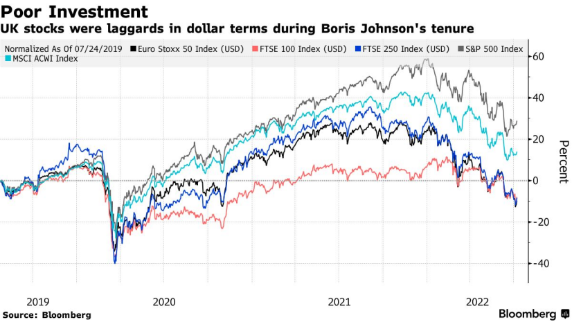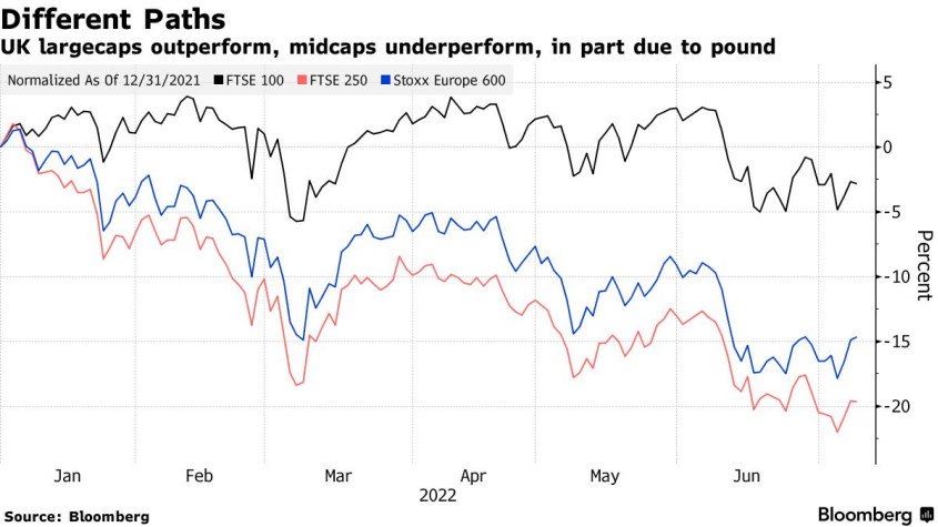 对于英国股市而言,如果新领导人对明年计划上调的公司税有异议,那么专注于国内的公司可能会受到提振。英国富时250指数2022年已下跌约20%。