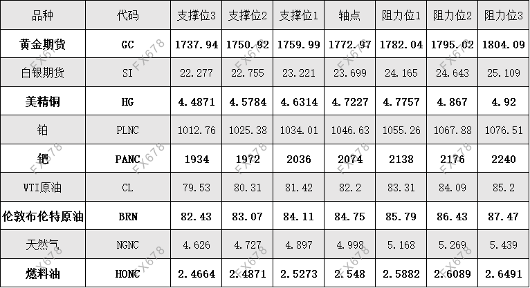 外盘黄金、白银、原油等商品期货阻力支撑位