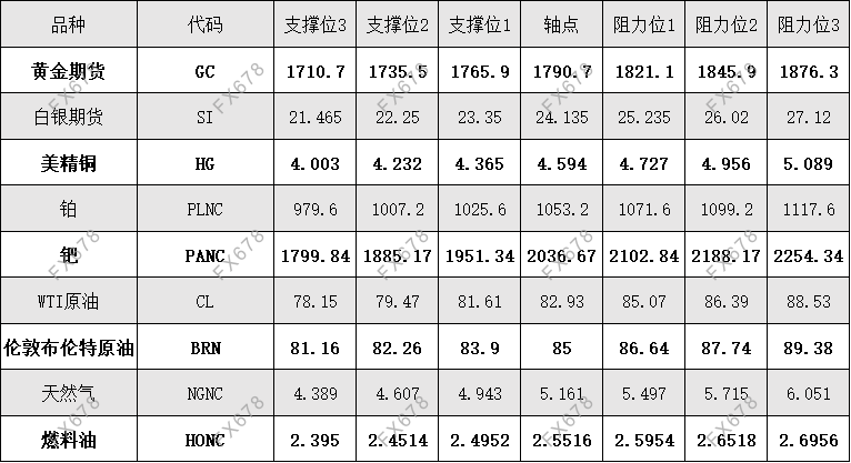 外盘黄金、白银、原油等商品期货阻力支撑位