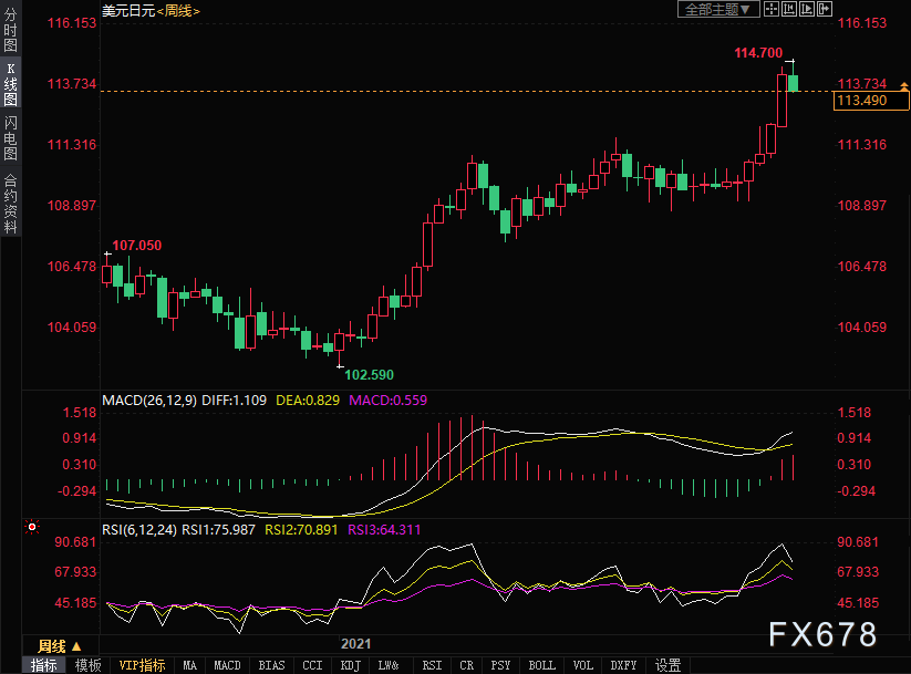 美元兑日元本周冲高回落,收跌0.64%,报113.49,结束周线四连涨的趋势,因美元下滑以及日本通胀上涨。