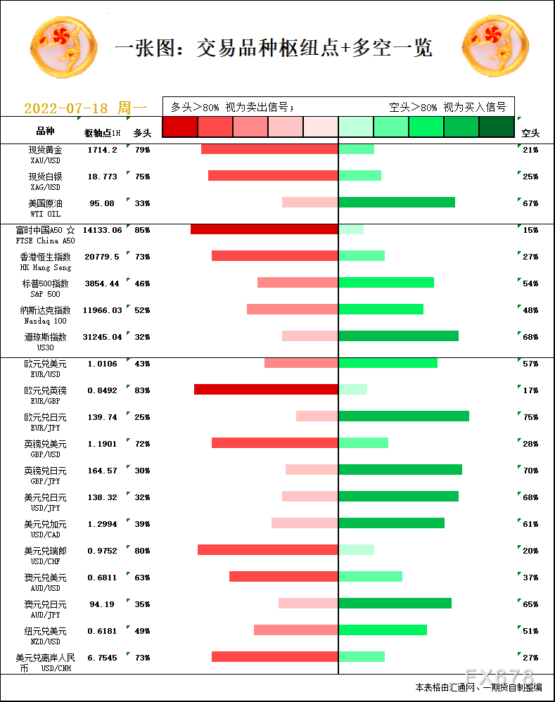 一张图:7月18日黄金白银、原油、股指、外汇“枢纽点+多空信号”;周一(7月18日)一张图看“枢纽点+多空信号”,品种包括:黄金、白银、原油、股指、欧元、英镑、日元、澳元、纽元、加元、富时中国A50、恒生指数、道指、标普500等。美联储官员暗示7月加息75点,美元回调,金价迎反弹良机?