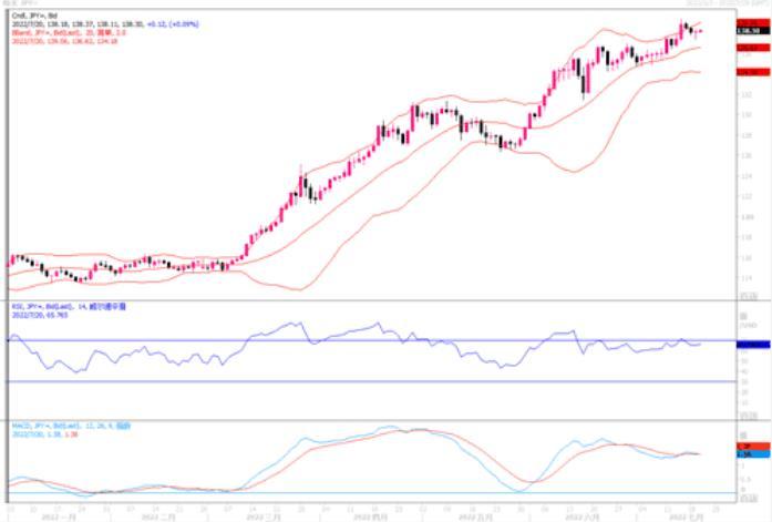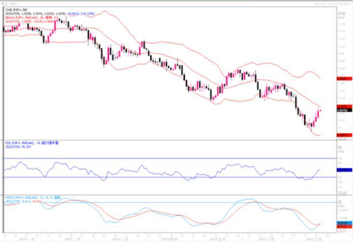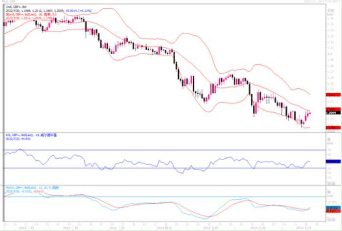 欧元兑美元周二(7月19日)上涨逾1.2%至1.0269。欧元上涨,主要有报道称欧洲央行决策者可能考虑在本周四的政策会议上加息50个基点,高于他们6月份暗示的加息25个基点。紧缩步伐快于预期的前景令欧元投资者感到宽慰。而周二当天,欧盟统计局公布数据显示,欧元区调和CPI在5月同比上升8.1%后,6月继续同比上升8.6%,继续创历史最高水平。通胀的严重飙升,更是加大了投资者对于本周欧央行将加大加息幅度的预期。近期美元自高位的回落,也间接助长了欧元的反弹。从日线图上看,欧元连续三个交易日拉出阳线,MACD形成金叉,RSI开始上冲均衡线,显示欧元存在较强的反弹势头。但整体上尚处于布林带下轨,目前中轨1.03附近料会构成较强的阻力。密切留意周四日内欧央行的利率决议和会后声明,若是欧央行能如预期般加息50基点,且对今后的加息态度保持高调,则欧元兑美元有望进一步反弹走高,目标1.04-1.05。