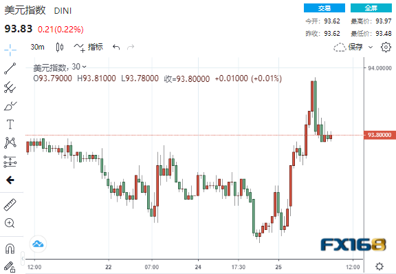 美元指数现上涨0.2,报93.83,此前在亚洲交易时段下跌至一个月低点,美联储主席鲍威尔上周五发表讲话,确认计划削减债券购买。