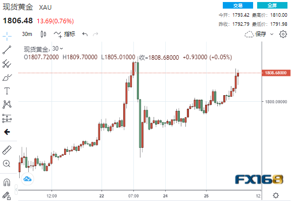 美市盘中,现货黄金延续涨势,日内涨幅扩大至1.0%并刷新日高至1810.00美元/盎司。