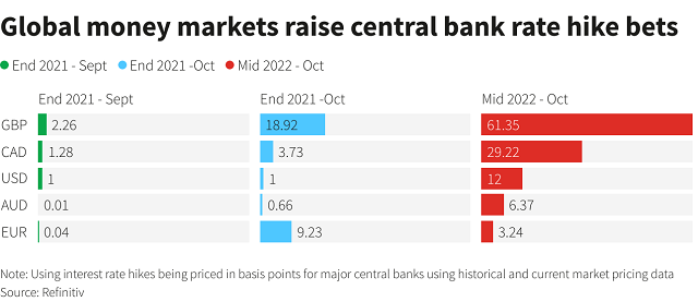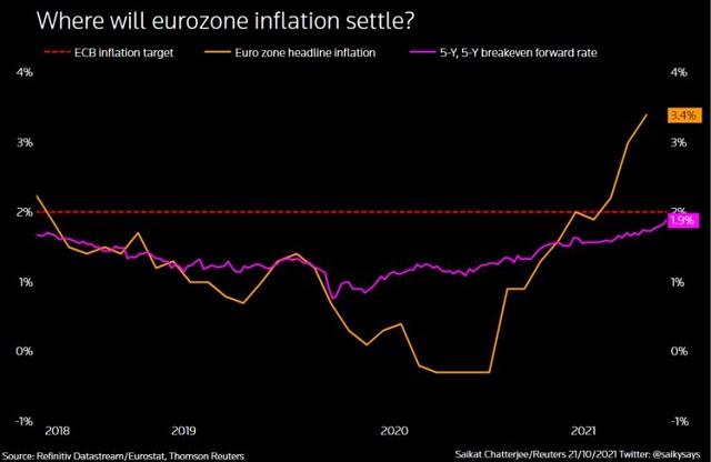 德国央行(Bundesbank)行长魏德曼(Jens Weidmann)对欧洲央行的超宽松货币政策持批评态度,上周他宣布计划在12月底早些时候辞职时,再次警告通胀风险。欧元区3.4%的通胀率是2008年以来的最高水平,预计年底将接近4%。一个关键问题是,如果通胀预期超过目标,带动薪资水平出现第二轮上涨,欧洲央行将如何行动?