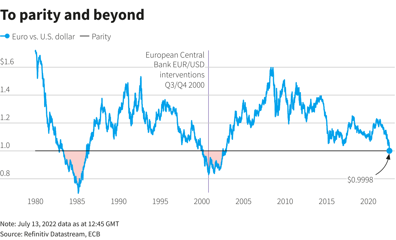 欧元兑美元20年来首次跌至平价,这给欧洲央行带来了问题。让欧元贬值会加剧已远高于其2%目标的通胀。欧洲央行以更鹰派的立场支撑欧元,或者更快速地加息,则可能打击经济增长,但一般认为不太可能采取提振欧元的举措。