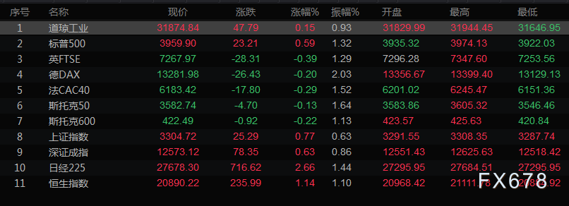美股收盘情况,道琼斯工业指数上涨0.15%,至31874.84点;标普500指数上涨0.59%,至3959.9点;纳斯达克指数上涨1.58%,至11897.65。