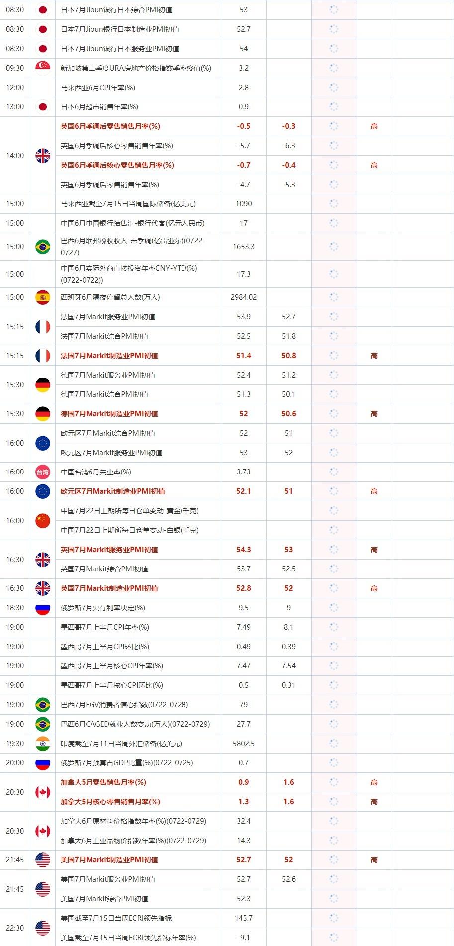 2022年7月22日,全球主要经济体将公布经济数据,需重点关注英国6月季调后零售销售月率,欧元区7月Markit制造业PMI初值,加拿大5月零售销售月率,以及美国7月Markit制造业PMI初值。大事方面需关注:俄罗斯央行公布利率决议。