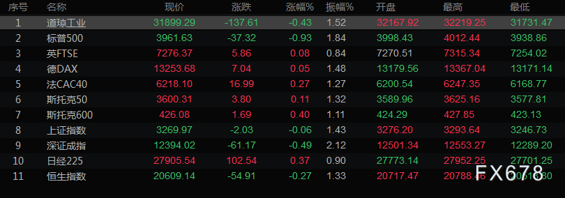 美股收盘情况,道琼斯工业指数下跌0.43%,至31,899.29点;标普500指数下跌0.93%,至3,961.63点;纳斯达克指数下跌1.87%,至11834.11。