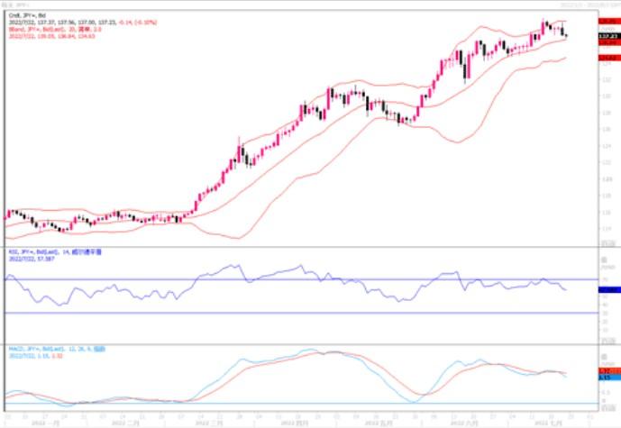 周四(7月21日)日本公布的最新数据显示,今年上半年日本贸易逆差超过79000亿日元,创下1979年有可比数据以来的同期新高。作为一个能源和材料严重依赖进口的国家,日本的贸易收支状况正在大幅恶化。而同日,日本央行行长黑田东彦举行了记者会,会上其表示,日元快速贬值对经济不利,不希望看到出现这样的状况。但同时强调,日本央行完全没有加息的计划,现在加息将给日本经济带来巨大的冲击。日本央行在当日结束的为期两天的货币政策会议上,继续维持超宽松货币政策不变。从宏观面上来说,日元将会继续扮演着被融资售出进行套利货币的角色。但由于近期出现高位获利回吐调整,4小时图上美日出现连续回落之态。从日线图上观察,美日仍处在高位区域整理之中,汇价目前仍处20期均线上方,下方135-136区域是整理的密集支撑区域。若美日不下穿上述区域,经过整理后的走势仍存在继续测试140甚至更高水位的可能性。