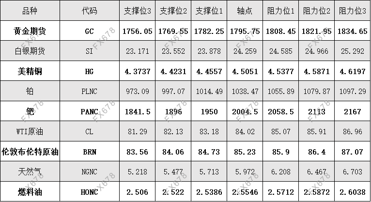 外盘黄金、白银、原油等商品期货阻力支撑位