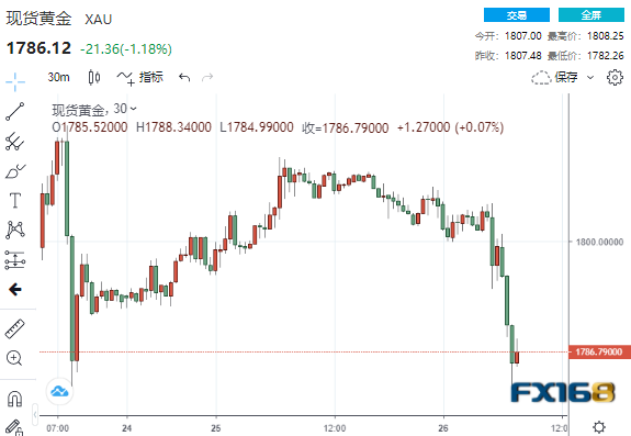 美市盘中,现货黄金遭遇猛烈抛售,刷新日低至1782.26美元,当日下跌逾1%,较日高回落26美元。