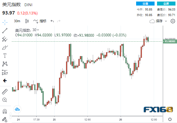 美市盘中,美元指数一度突破94关口,触及94.03高点,现回落至这一关口略下方交投。该指数在本月早些时候触及的一年高点94.56和周一触及的一个月低点93.48之间徘徊。