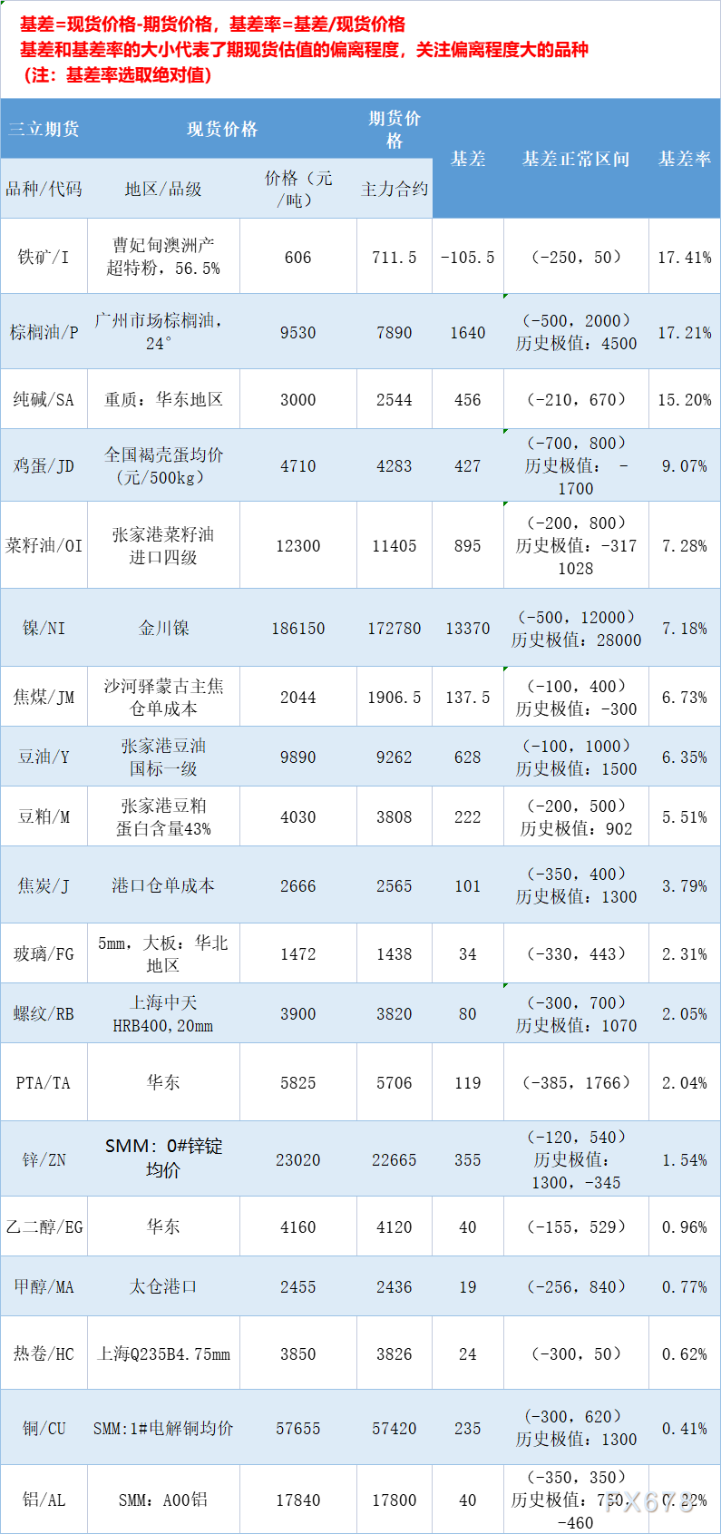三立期货7月26日基差:一张图尽览有色金属、黑色系、能源化工和农产品基差(按基差率从大到小排序)