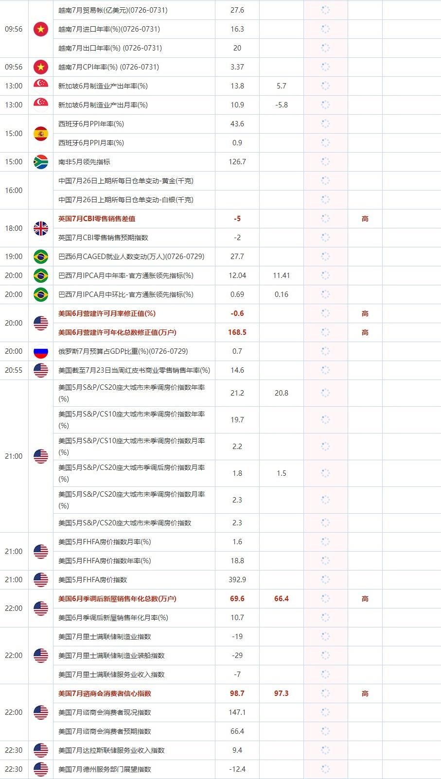 2022年7月26日,全球主要经济体将公布经济数据,需重点关注英国7月CBI零售销售差值,美国6月营建许可月率修正值,美国6月季调后新屋销售年化总数,以及美国7月谘商会消费者信心指数。大事方面需关注:欧盟召开能源部长特别理事会会议。