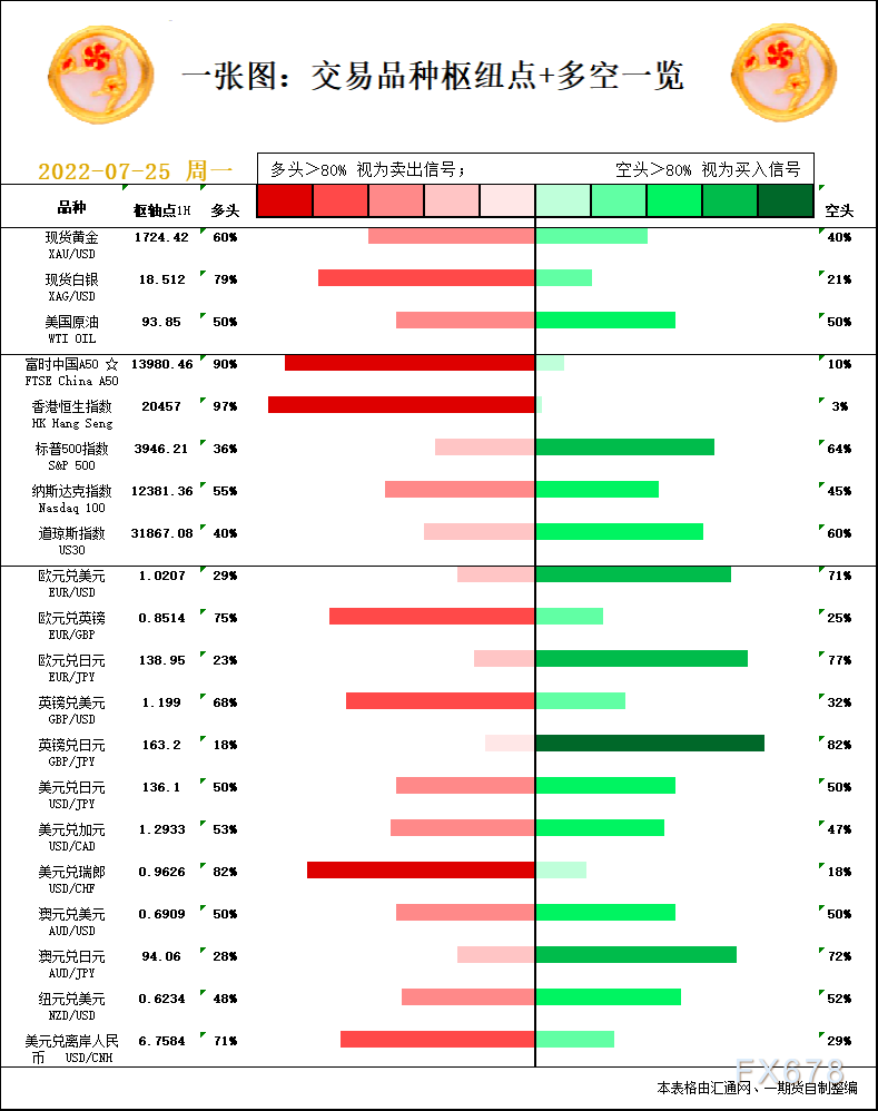 一张图:7月25日黄金白银、原油、股指、外汇“枢纽点+多空信号”;周一(7月25日)一张图看“枢纽点+多空信号”,品种包括:黄金、白银、原油、股指、欧元、英镑、日元、澳元、纽元、加元、富时中国A50、恒生指数、道指、标普500等。本周将迎美联储决议和美国二季度GDP,多头机会来了