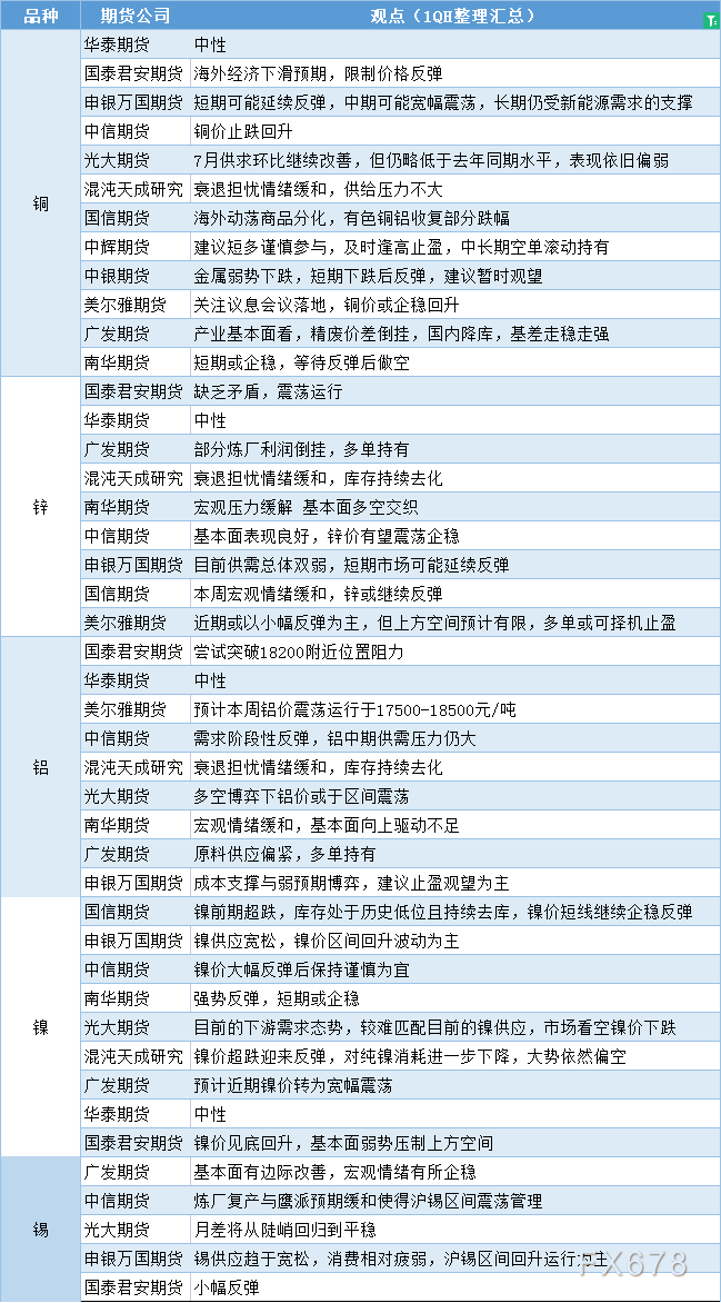 期货公司观点汇总一张图:7月25日有色系(铜、锌、铝、镍、锡等)
