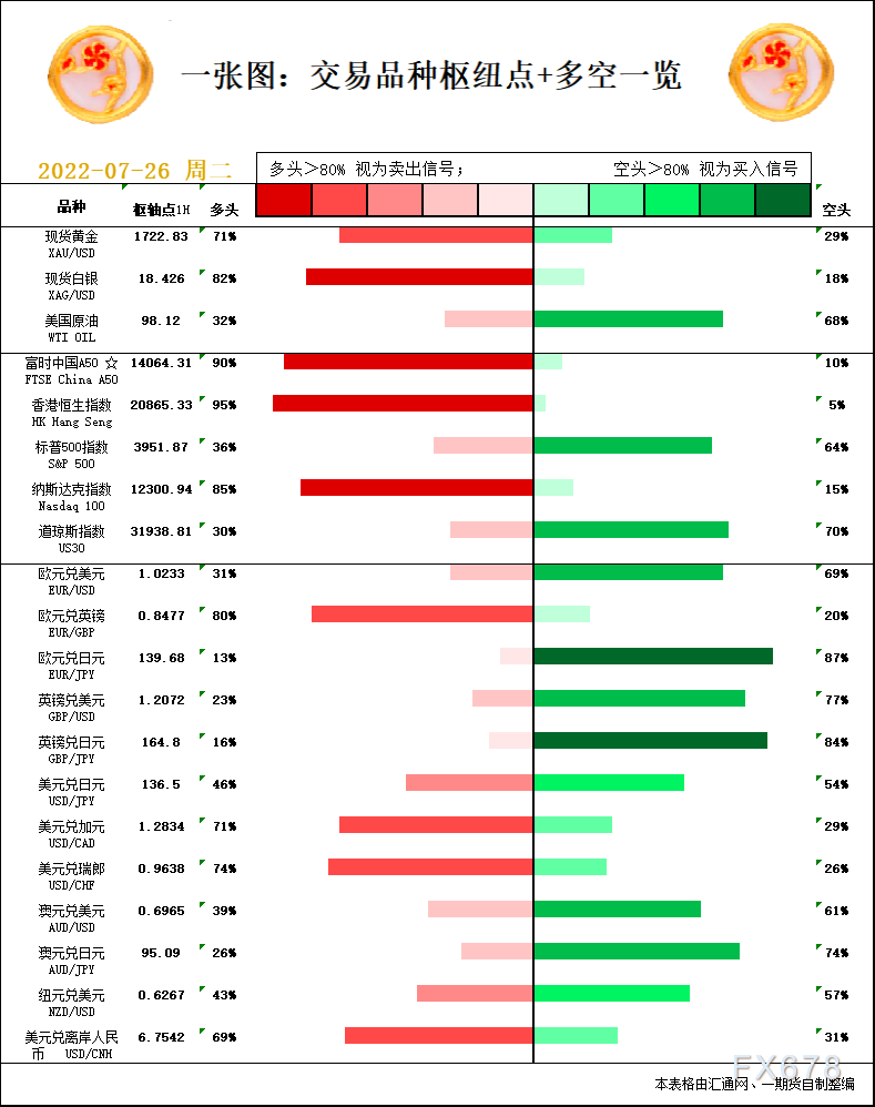 一张图:7月26日黄金白银、原油、股指、外汇“枢纽点+多空信号”;周二(7月26日)一张图看“枢纽点+多空信号”,品种包括:黄金、白银、原油、股指、欧元、英镑、日元、澳元、纽元、加元、富时中国A50、恒生指数、道指、标普500等。美联储加息前景支撑美债收益率,多头还有机会吗?