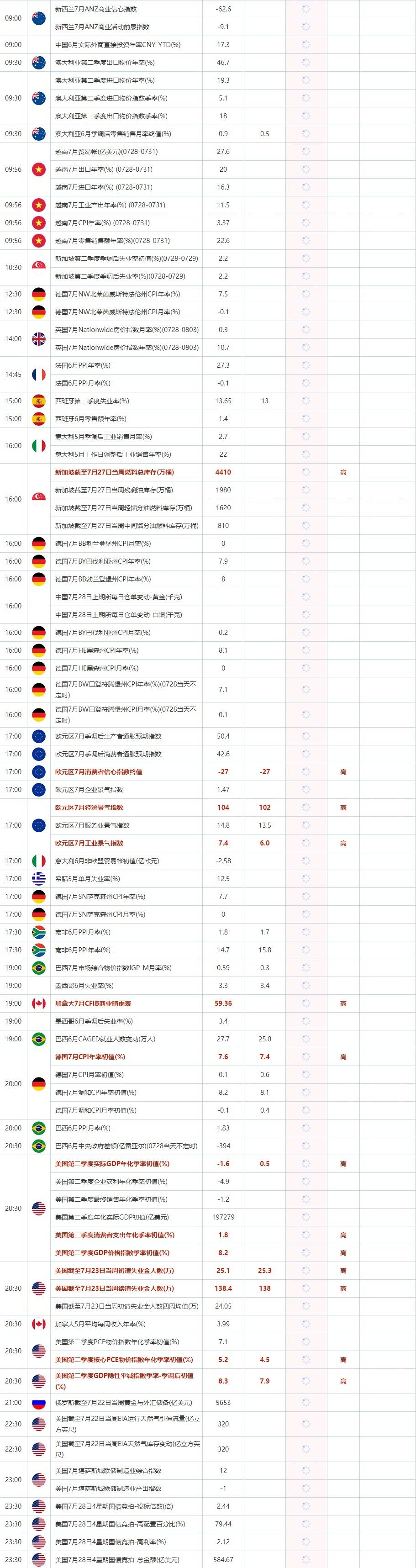 20:30 美国第二季度核心PCE物价指数年化季率初值(%) , 前值 5.2 , 预期值 4.5 , 公布值:待发布