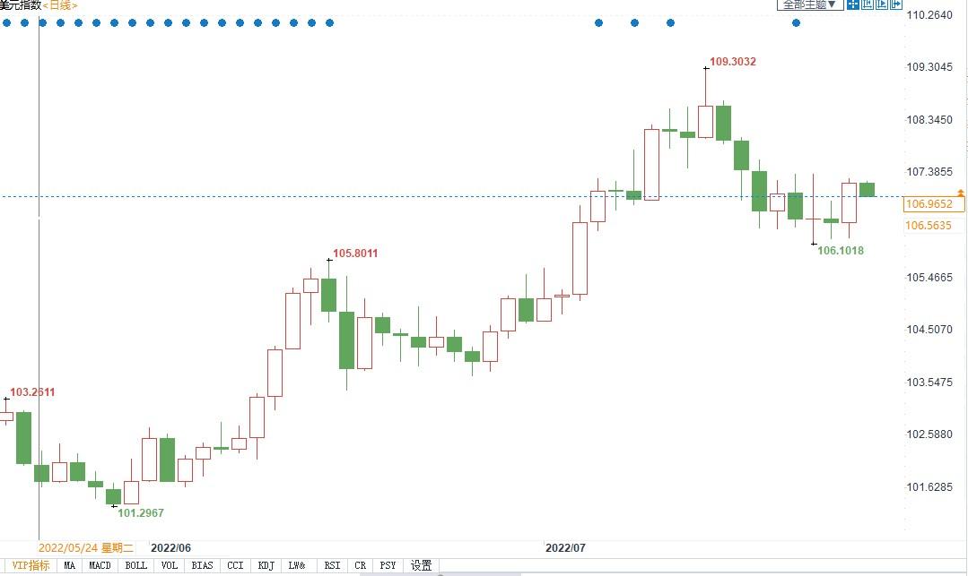 美元指数7月14日创下20年高点109.30,随后出现回调,目前交投于107附近。由于美国经济衰退和美联储7月份加息75个基点已被市场完全消化,基准的10年期美国国债收益率目前处于近两个月低点。