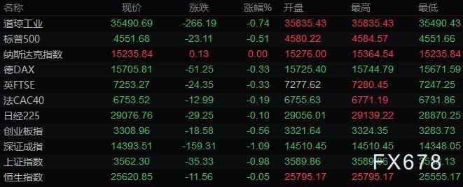 美股收盘情况:道琼斯指数收跌266.25点,跌幅0.74%,报35490.63点;标普500指数收跌21.79点,跌幅0.48%,报4553.00点;纳斯达克综合指数较上一交易日基本持平,报15235.84点;罗素2000指数下跌1.9%,为9月末以来最大跌幅。